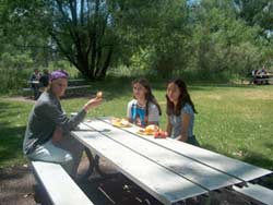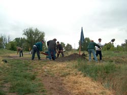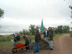 12年間、春と秋に行われている日本館メンバーによる勤労奉仕。その行動力から「日本館アーミー」とまでいわれています。今春の作業はデンバー郊外にある大きな公園の散策道の砂利敷きと雑草抜き。朝8時30分、小雨も晴れ上がり恒例のストレッチ。常連の顔に混じって新人も家族と一緒に。また子供クラスから大人のクラスに入ったばかりのターリヤさんとブランデン君も仲間入り。このプログラムはデンバー市の「ハンド オン デンバー」プロジェクトとして全市規模で行われているものですが、このプログラムは12年前に日本館が始めてシビックセンター公園の勤労奉仕をしたのがきっかけとなったものです。参加された皆様、リーダーのメリー パオさんご苦労さまでした。本間館長、参加した日本館シニアメンバーのMSケリーからのレポートがあります。
