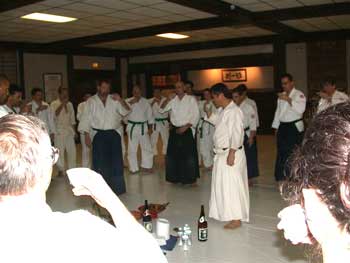 深夜にも拘らず多くの門下生が、沈黙の道場に集まってくれている。この日だけは神道行事をする。手を打ち、天津祝詞を奏上し神々の名を唱える。日本館は宗教の場ではない。従ってこの会も事前に神道行事があることを教えて、個人の宗教を侵害しないよう気を使う。クリスマスで騒ぎ、正月で神に願いお盆で仏にすがる日本人の不思議な器用さを持たない、信仰深いアメリカ人に敬意を表してである。