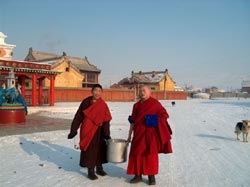 翌日、ここ数年のモンゴル訪問時の恒例となった「ガンダン寺」を参拝し、昨年デンバー日本館をモンゴル大統領一行と訪れた、モンゴル最高位ラマ僧(ハンバラマ)チョウザンツ師と年末勤行中の寺院内で再会しました。