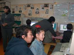 | 寄贈されたコンピューターに取り組む子供達、講師は日本館モンゴルスタッフのインクさん |