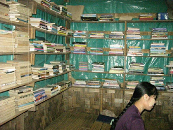 粗末なテントで屋根をかけたスペースですが30人ほどが熱心に勉強しています。しかし雨季に入ると膝まで水が入り二階の家族の部屋で勉強をする事も有る状態です。今回の本間館長の訪問で、教室の移転、コンピューター5台の設置、参考書、蔵書の充実などが話し合われました。